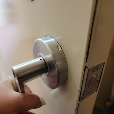 We'll come prepared with parts and the right tools to get to the root of the problem. Our technician will try to service the lock first, to make sure the problem isn't build-up within the lock. If the problem isn't resolved by maintenance (or a door adjustment), the technician will attempt to repair the hardware. In the event that repair isn't possible, the technician will discuss replacement options with you and put you in contact with a team member in the office so we can get parts ordered if necessary.